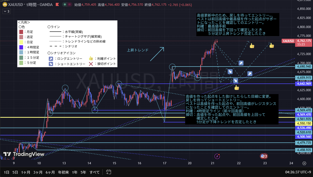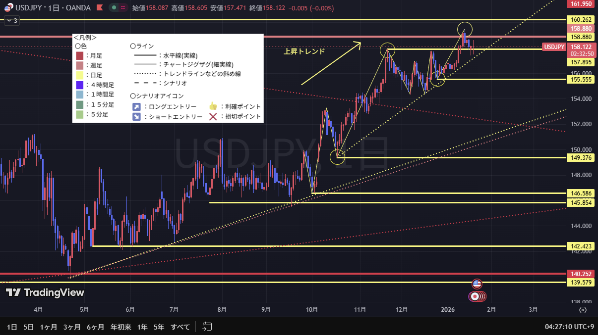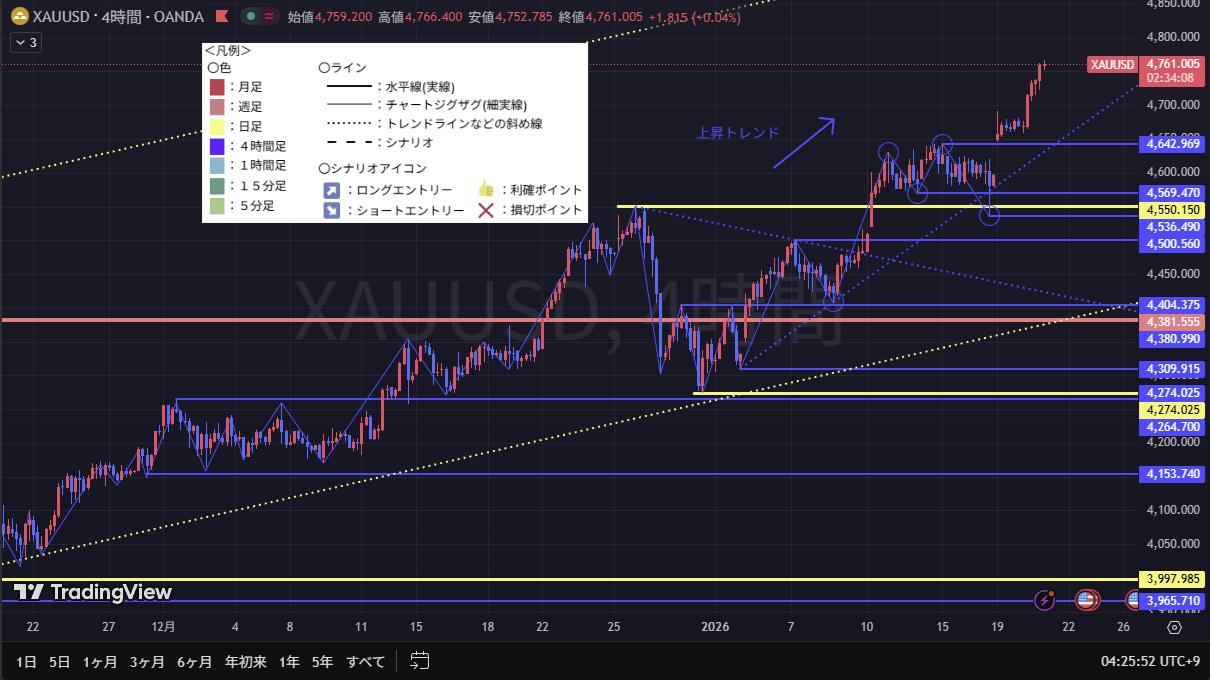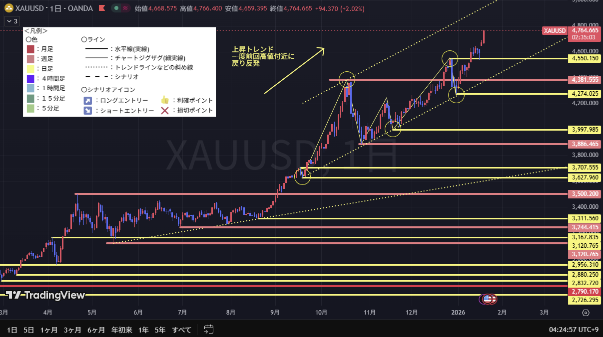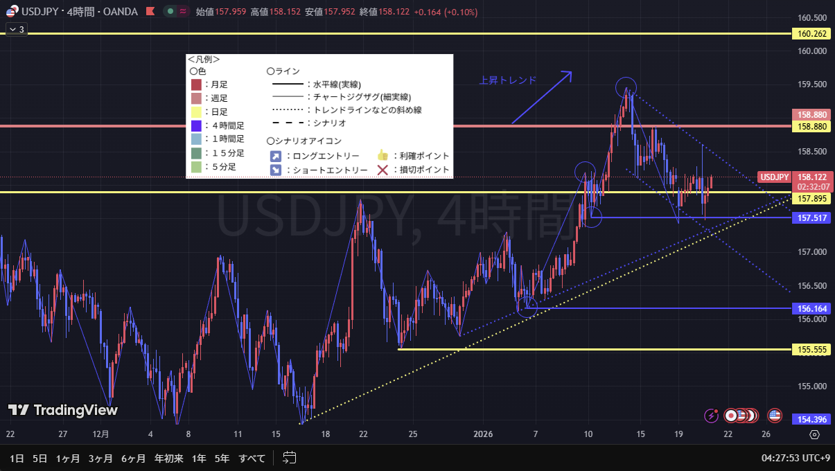 日足、4時間足ともに上昇トレンドであるため、メインはロングでのシナリオだが、