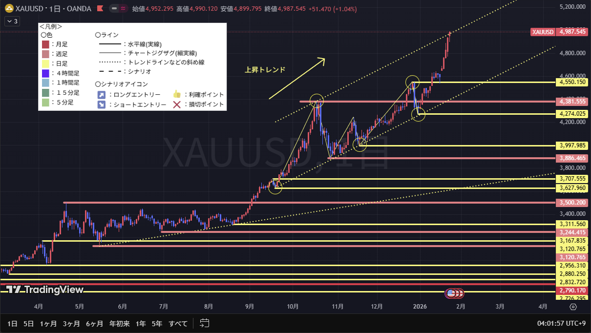 上昇の下限を基準としたチャネルラインの上限+キリ番の”5000″付近の価格。