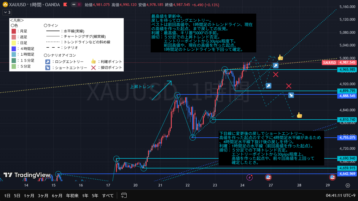 キリ番”5000”や日足のチャネルラインが付近にあり、一度戻すと可能性が考えられる。