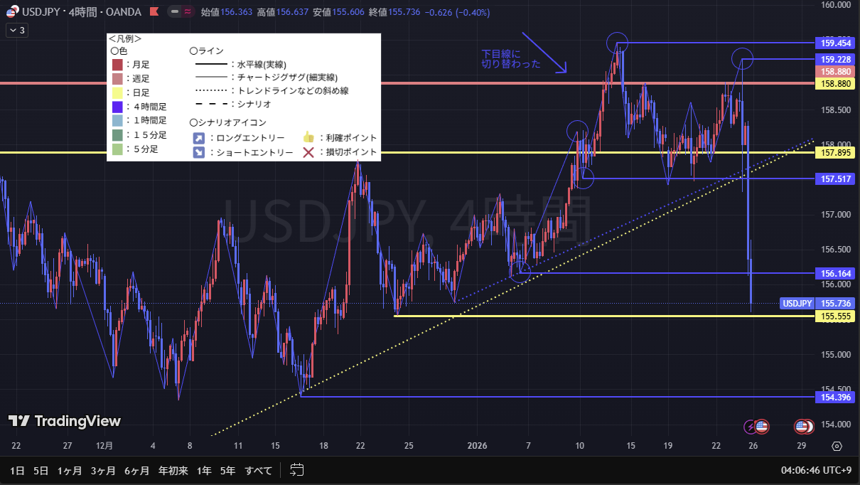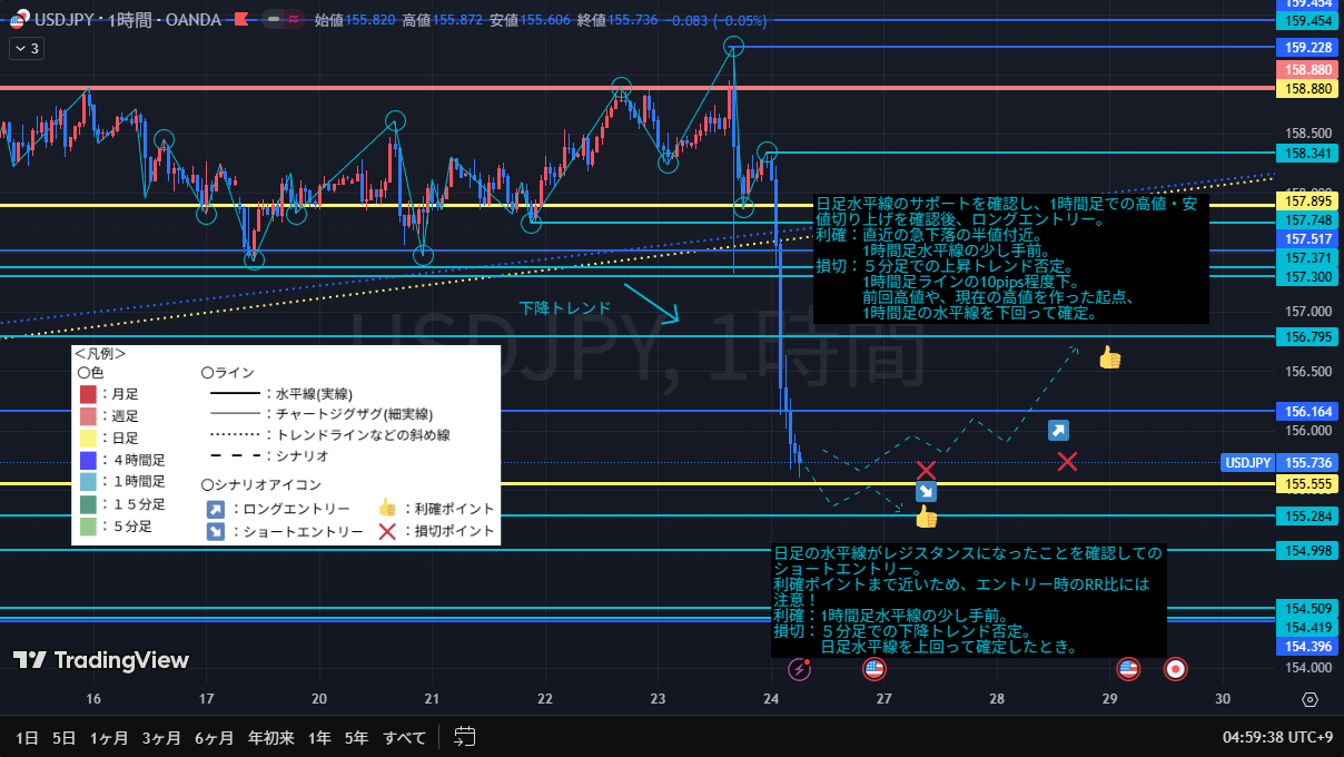 4時間足、1時間足は下目線のため、急下落の半値付近での利確などにとどめる。