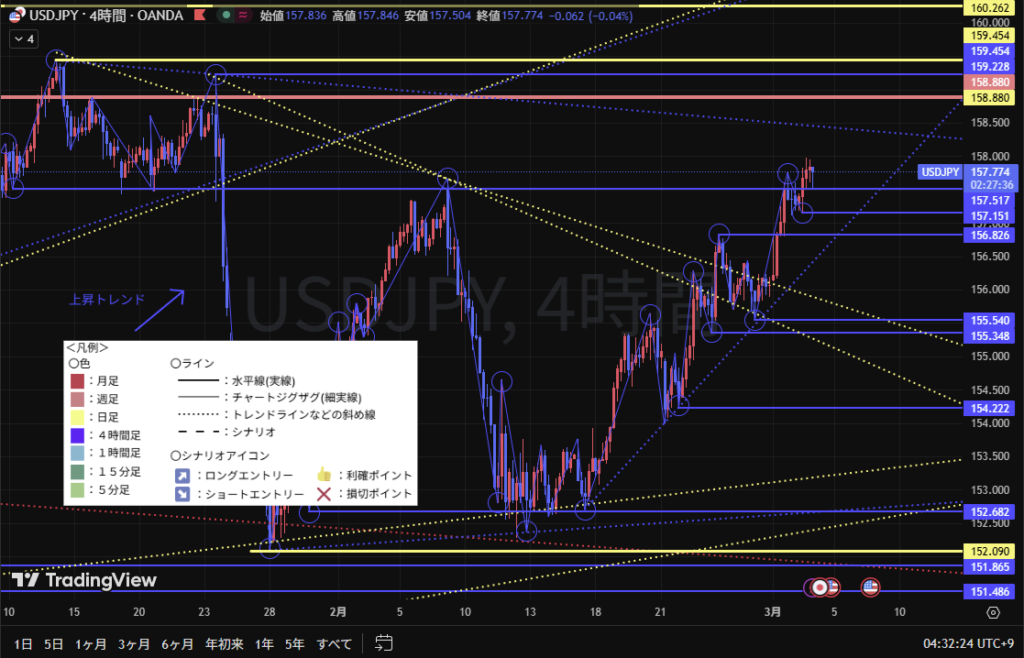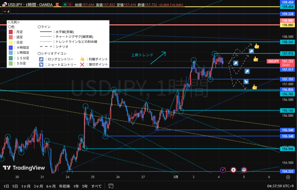 4時間足水平線や直近高値を上抜けた後の戻しを待ってロングエントリーを検討。