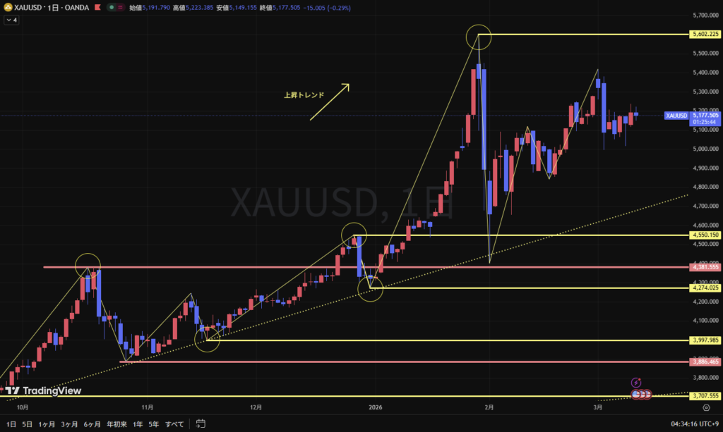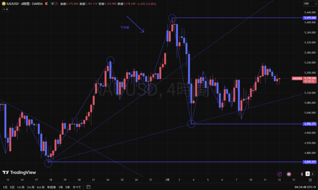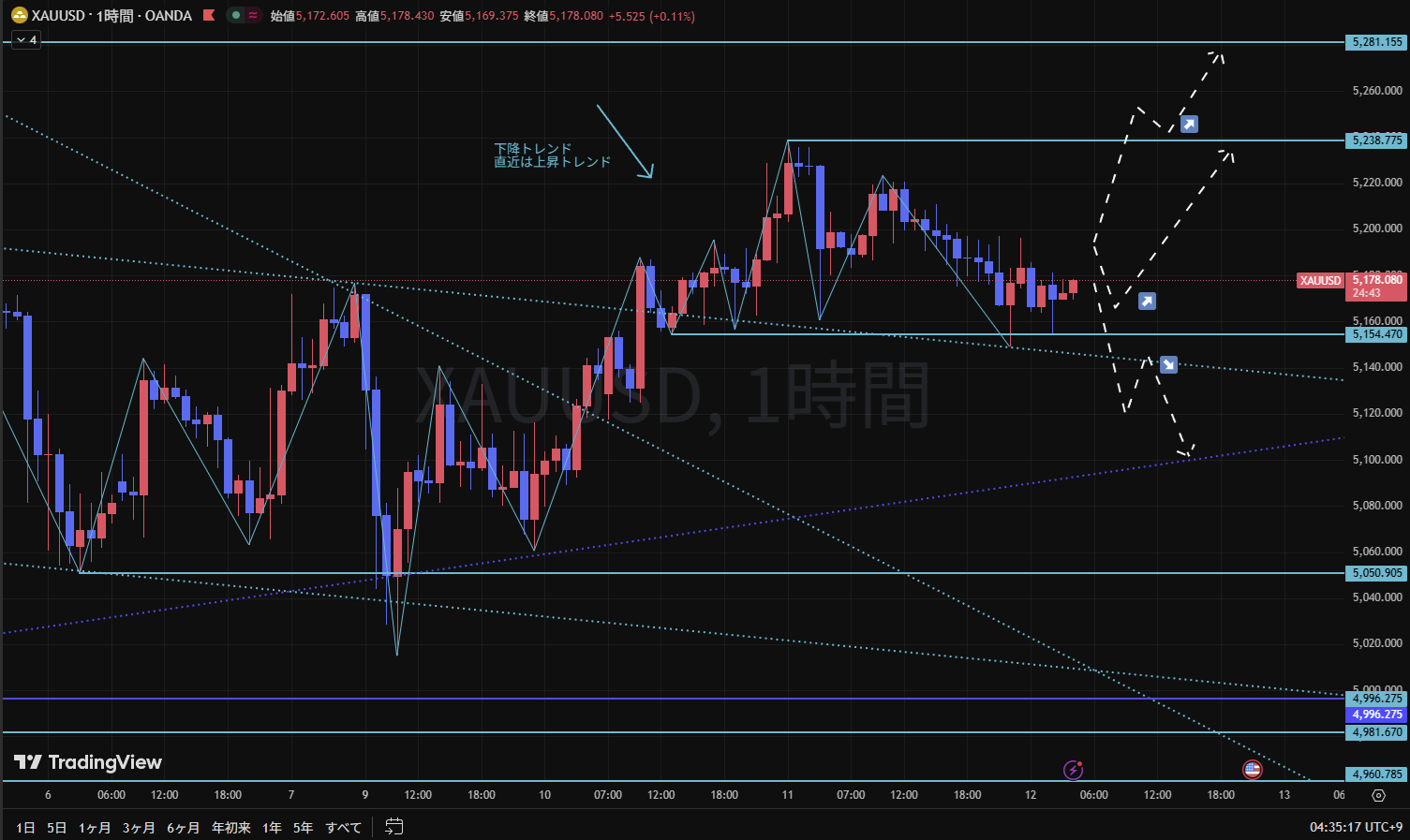 そのため、1時間足の目線は下目線だが、1時間足も可能性ダウの状態にあり、GOLD全体としてはロングエントリーが主力であることもあるため、ロングエントリーをメインシナリオとする。