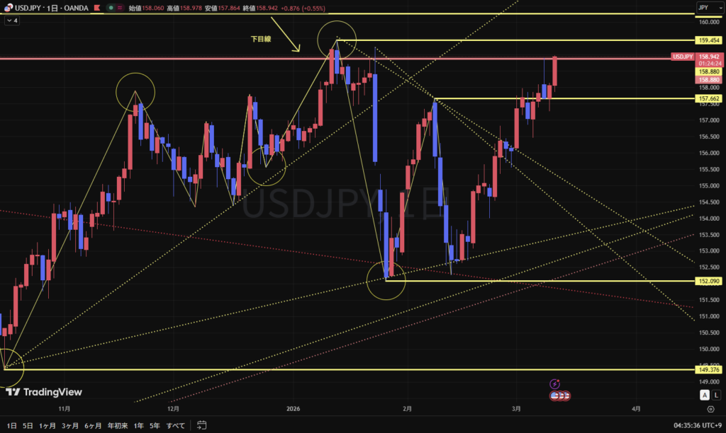 ただ、週足の水平線を超えてきており、今日、明日で週足をレジスタストするような戻しが発生する可能性がある点には注意が必要。