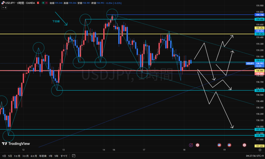 4時間足は下目線ではあるが、日足、1時間足の目線に合わせて、ロングエントリーをメインシナリオとする。