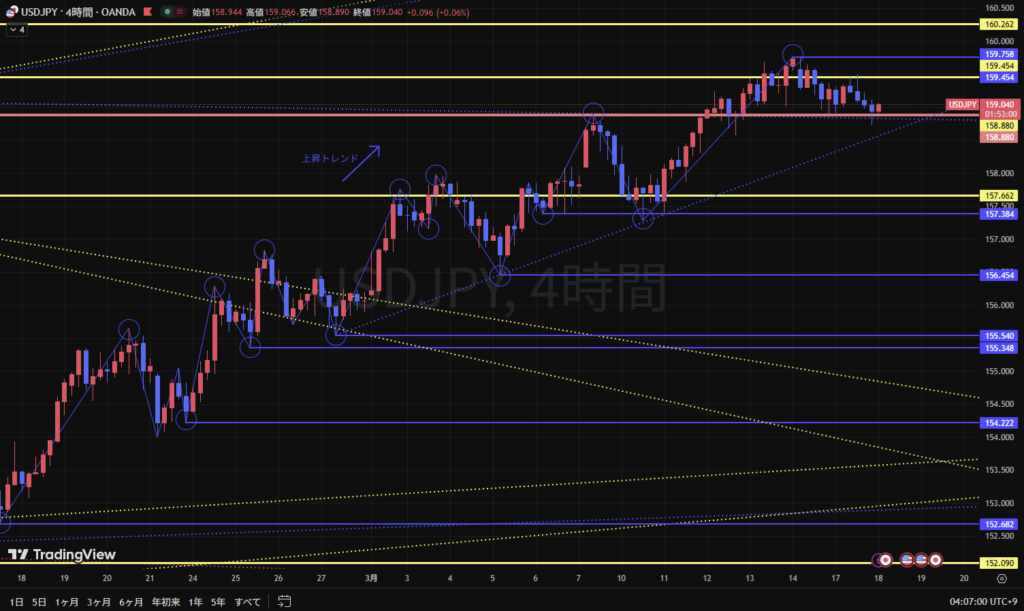経過時間によっては、ずっと意識されている4時間足トレンドラインが近づいてくる。