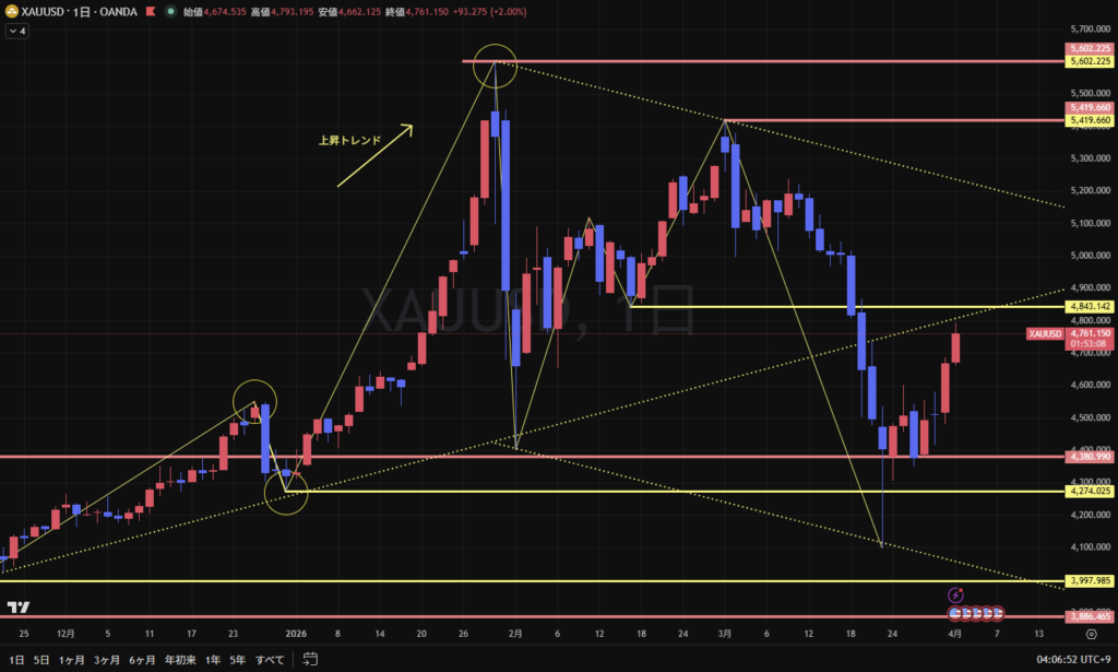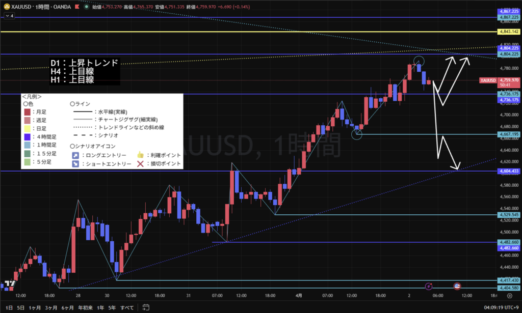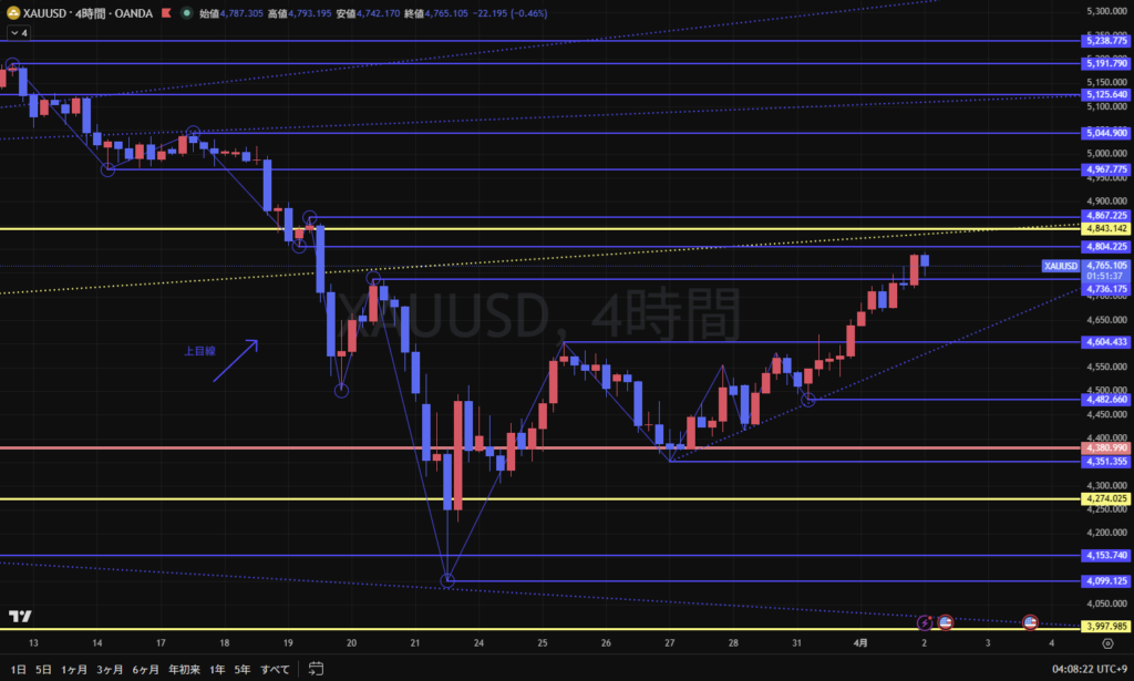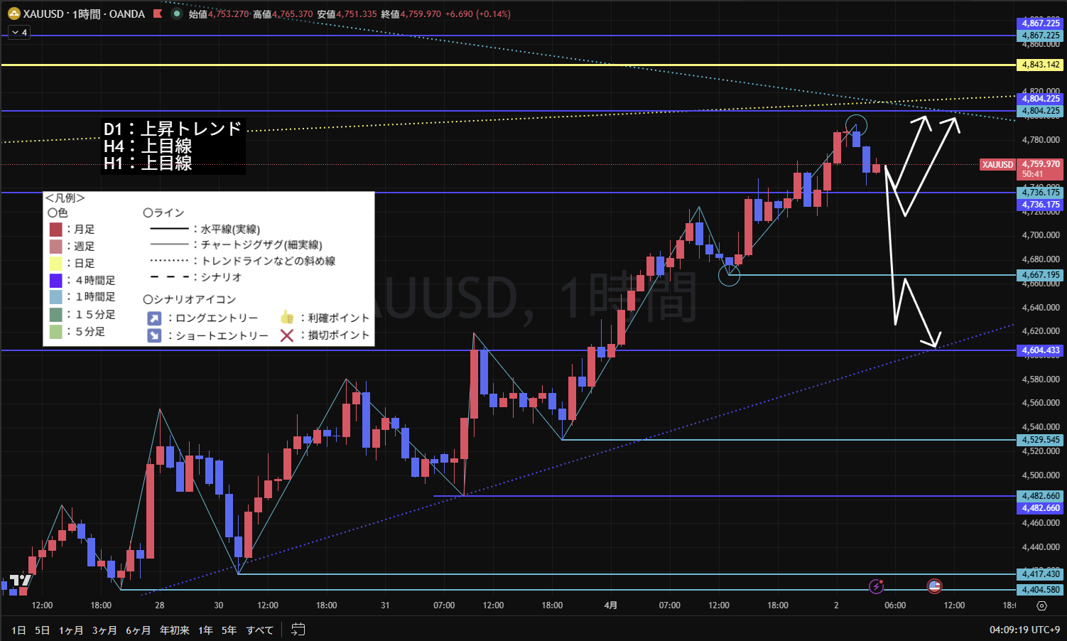 ただ、世界情勢の不安定さや、日足・4時間足と1時間足で目線が異なっていることから、今回は1時間足の目線が上目線に切り替わるまでエントリーを控えようと考えている。
