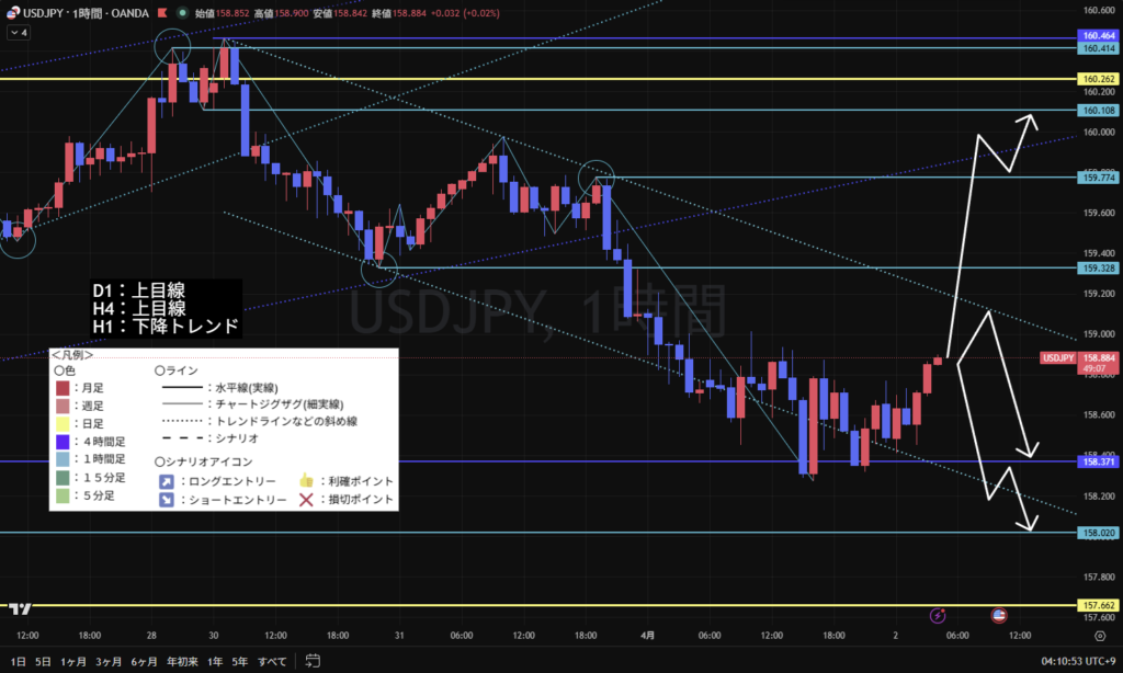 1時間足が下降トレンドであるため、ショートエントリーをメインシナリオとする。