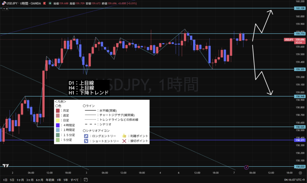 1時間足の目線に合わせてショートエントリーをメインシナリオとする。