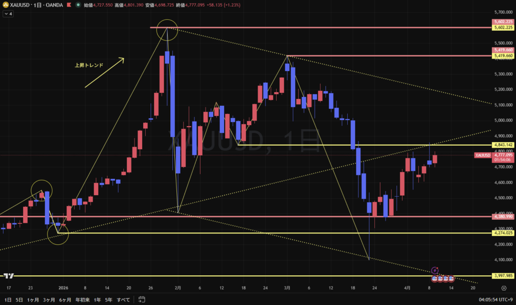 直近最高値の前の高値(4/2)と同じ価格帯 4800 で陰線を形成し始めている。