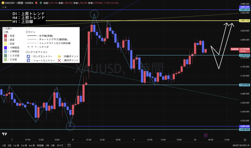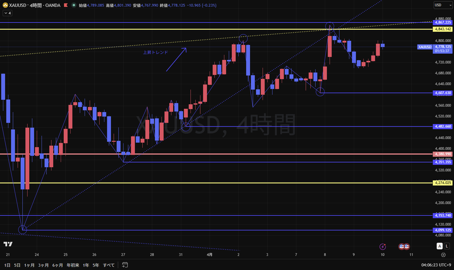 4時間足は上昇トレンド継続。