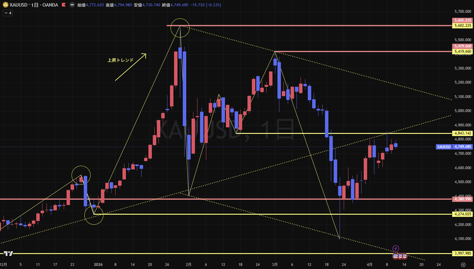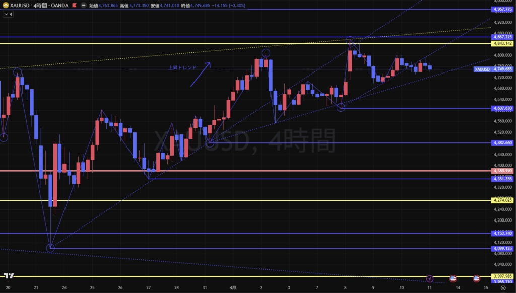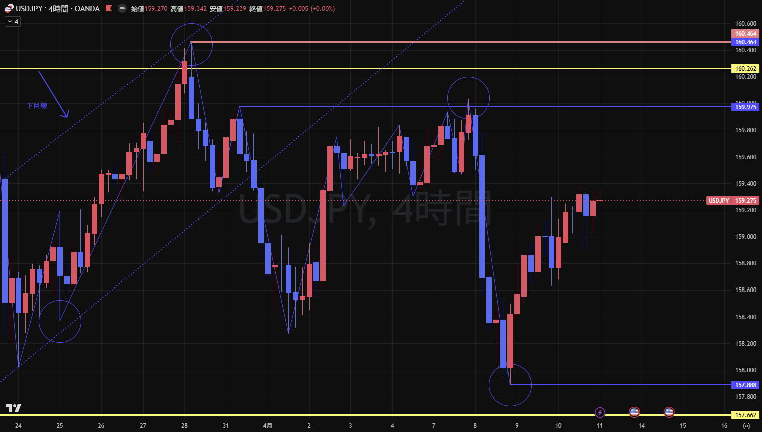 4/10(金) 21:00の長い下ヒゲピンバーを下抜けるまではロングエントリーを検討する。