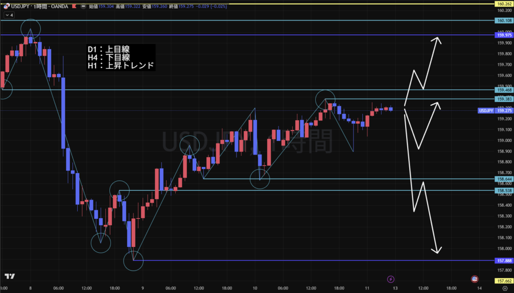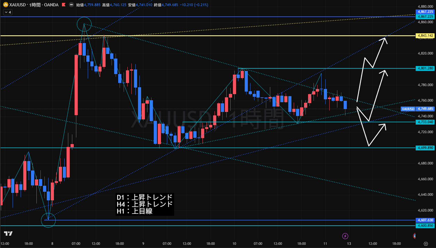 現在は高値・安値を更新できておらず、レンジになる可能性があるが、日足、4時間足、1時間足がすべて上目線であるため、ロングエントリーのみを検討する。