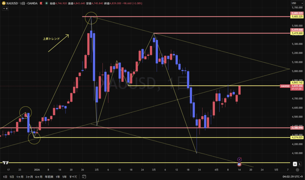 現在は、最高値を作った起点とその前回高値を作った起点の間で揉み合っている状況。