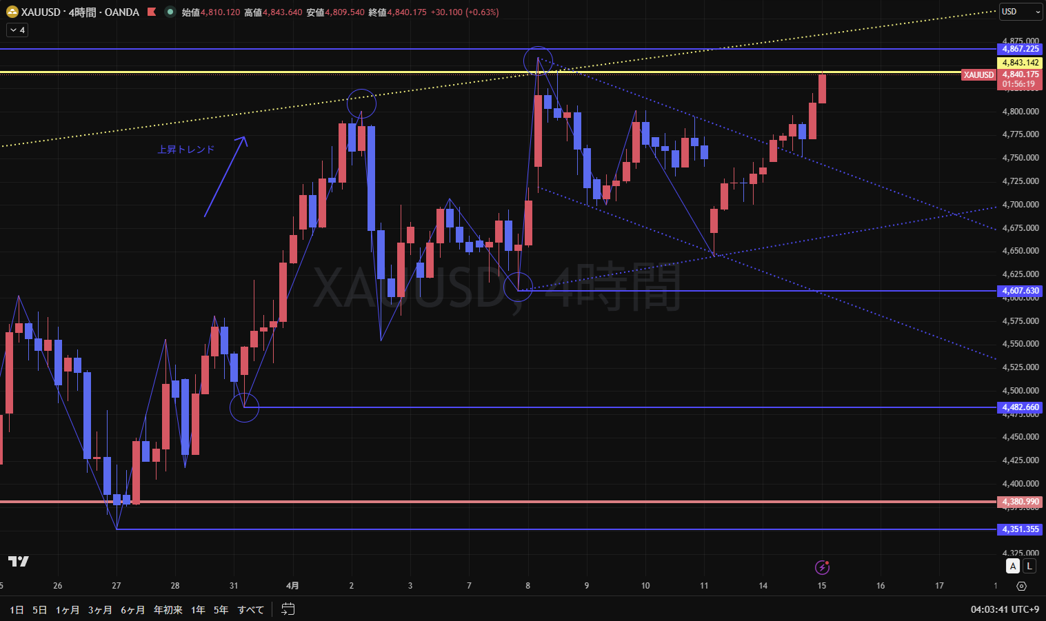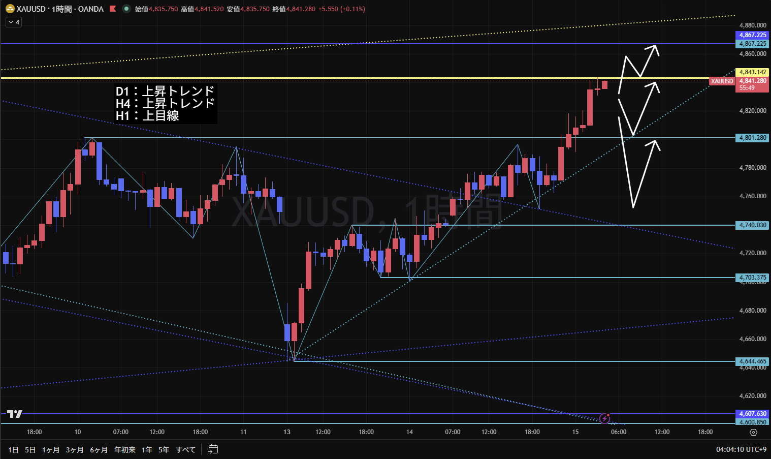 4時間足は上昇トレンド継続。
