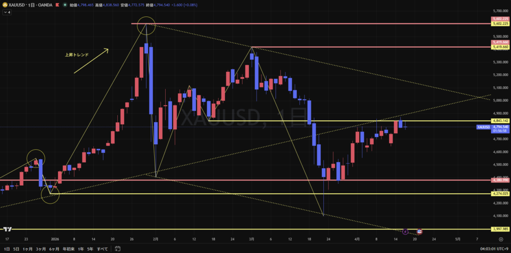 4/16 10:00台のローソク足で下ヒゲの長いコマ足陰線を作り、上昇してきている。