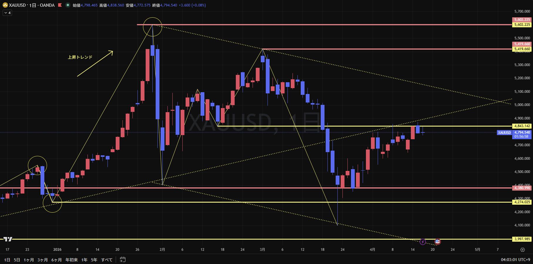 現在の価格から半値やフィボナッチ61.8などへの戻しを待ってロングエントリーを検討。