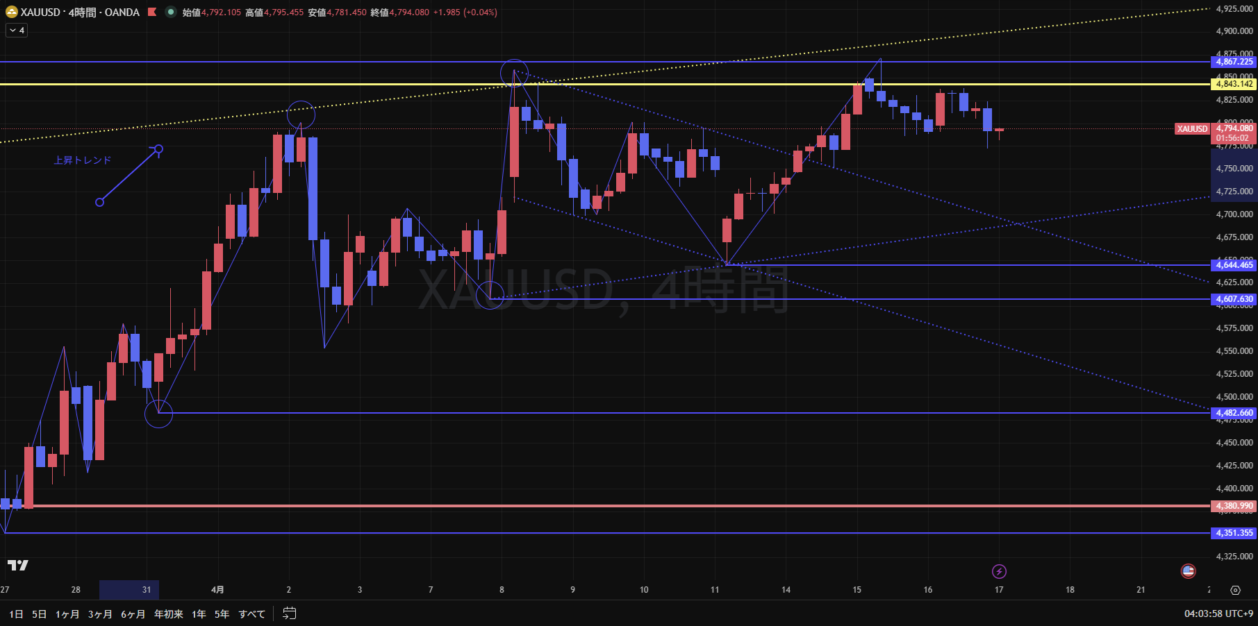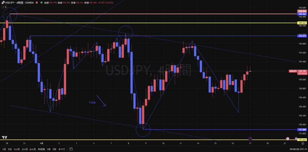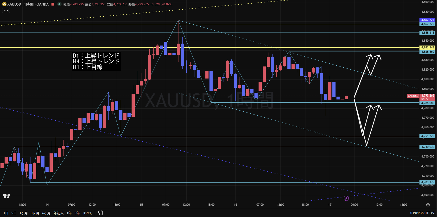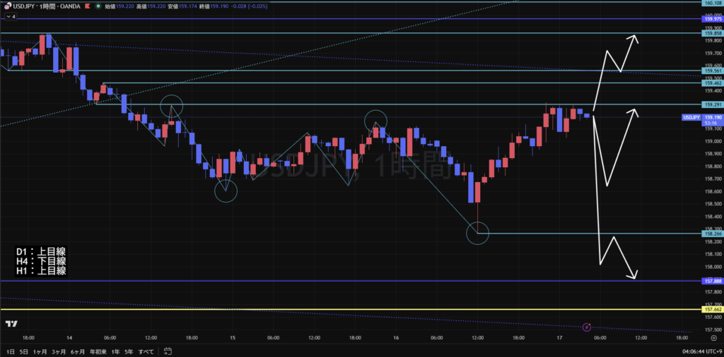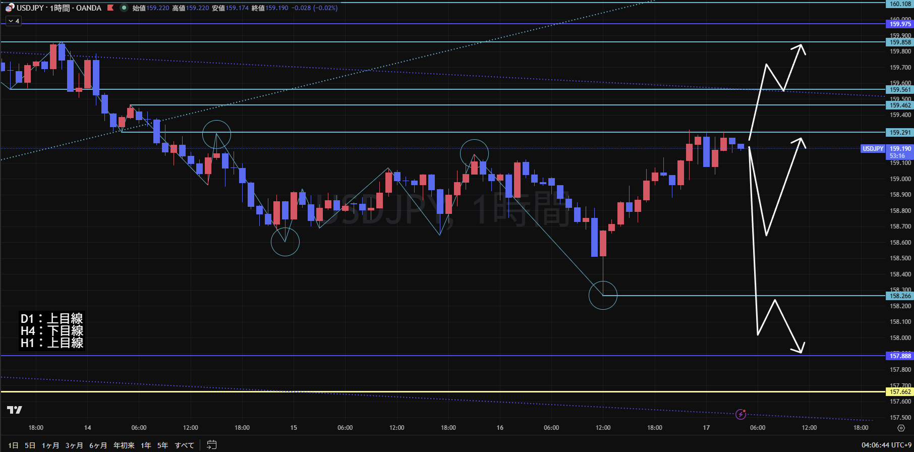 戻さすに上昇した場合、1時間足水平線が多くRR比が確保できないことと、すぐ上に4時間足の下降トレンドラインがあることから、4時間足トレンドラインを上抜け後の戻しを待ってロングエントリーを検討する。