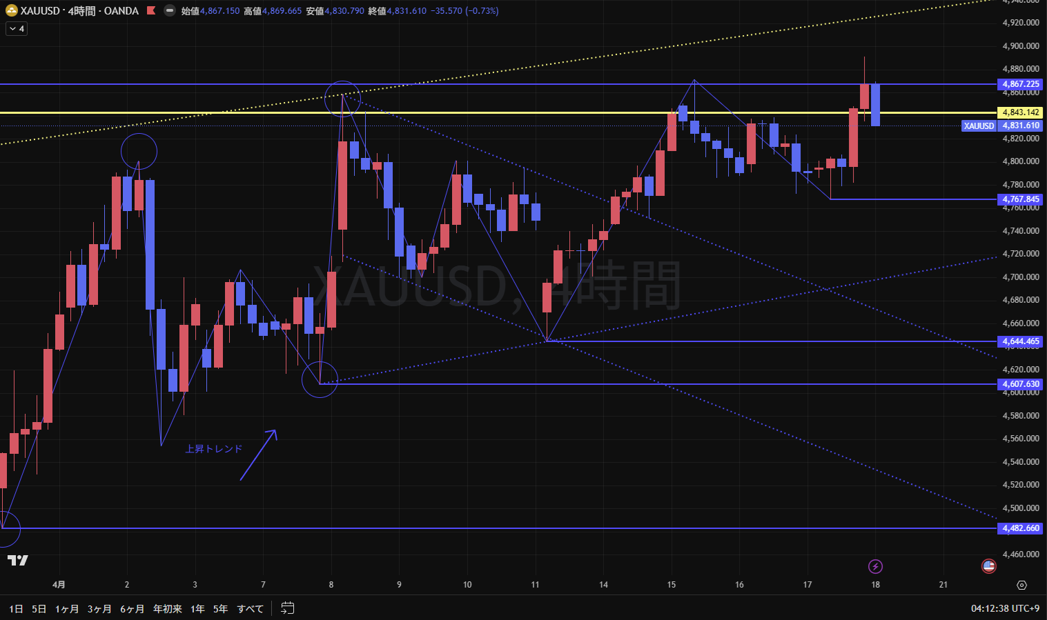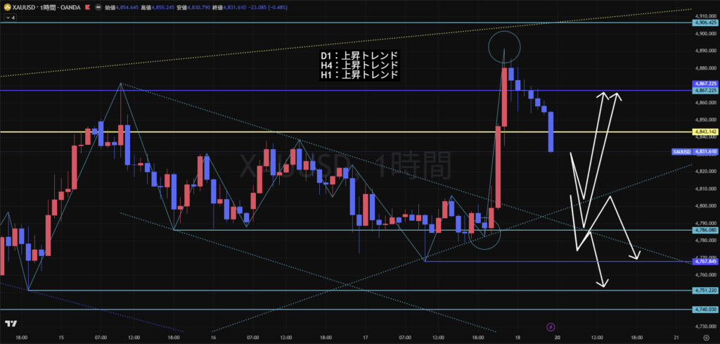 直近最高値を作った起点の1時間足水平線(4786)を下に抜けて下目線に転換した後、同水平線への戻しや1時間足の上昇トレンドラインへの戻しを待ってショートエントリーを検討。