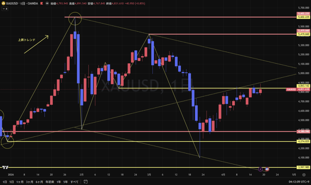 日足水平線(4843)付近での売り圧力が大きいように見える。