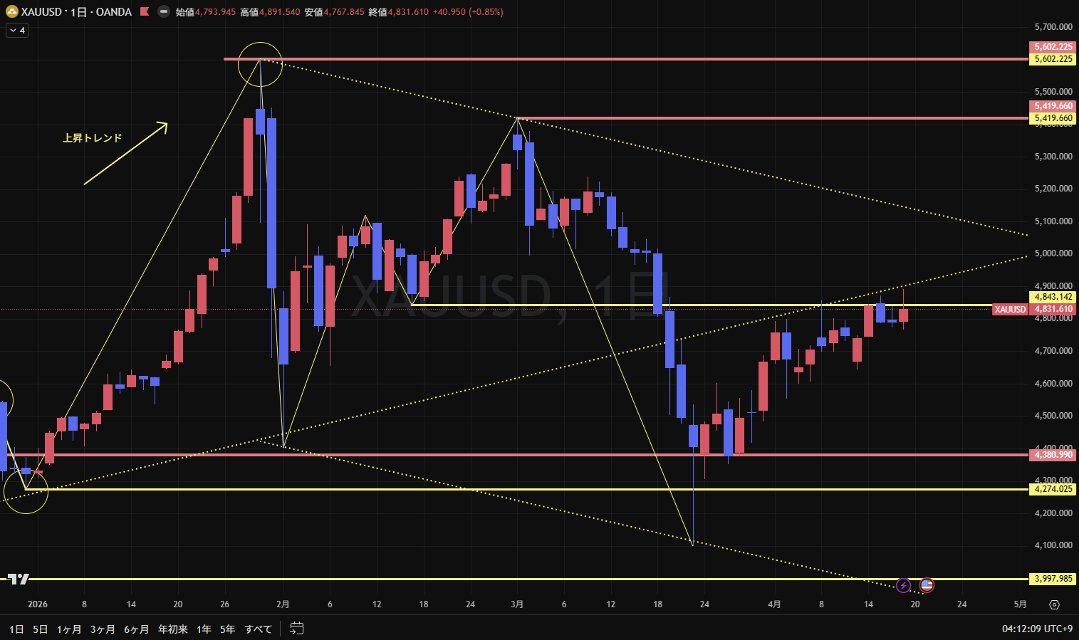 1時間足の上昇トレンドラインやディセンディングトライアングルの下限(4786)付近までの戻しを待ってロングエントリーを検討。