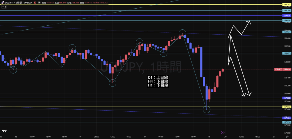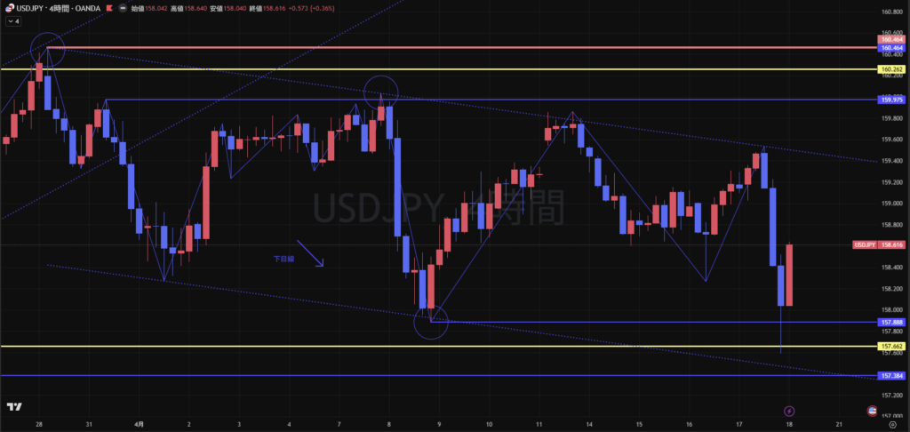 直近最高値を作った起点(159.02)付近や、4時間足下降チャネルの上限トレンドラインまでの戻しを待ってショートエントリーを検討。